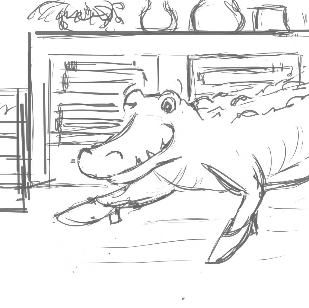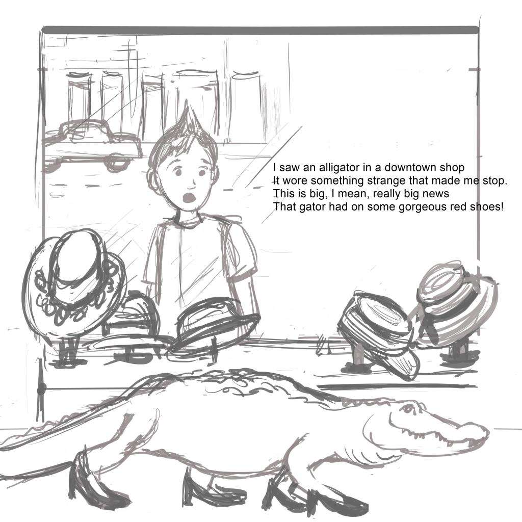 Well guess what my friends!! The Alligator’s Red Shoes is on the drawing table with Samantha Bell as illustrator again! I can hardly contain my excitement! She has sent the first batch of sketches and I want to share a couple with you. Just like The Sneezing Toucan, I will be asking young students to submit drawings for the website, so be on the lookout for that announcement soon. Here are a couple of the first sketches Samantha sent.