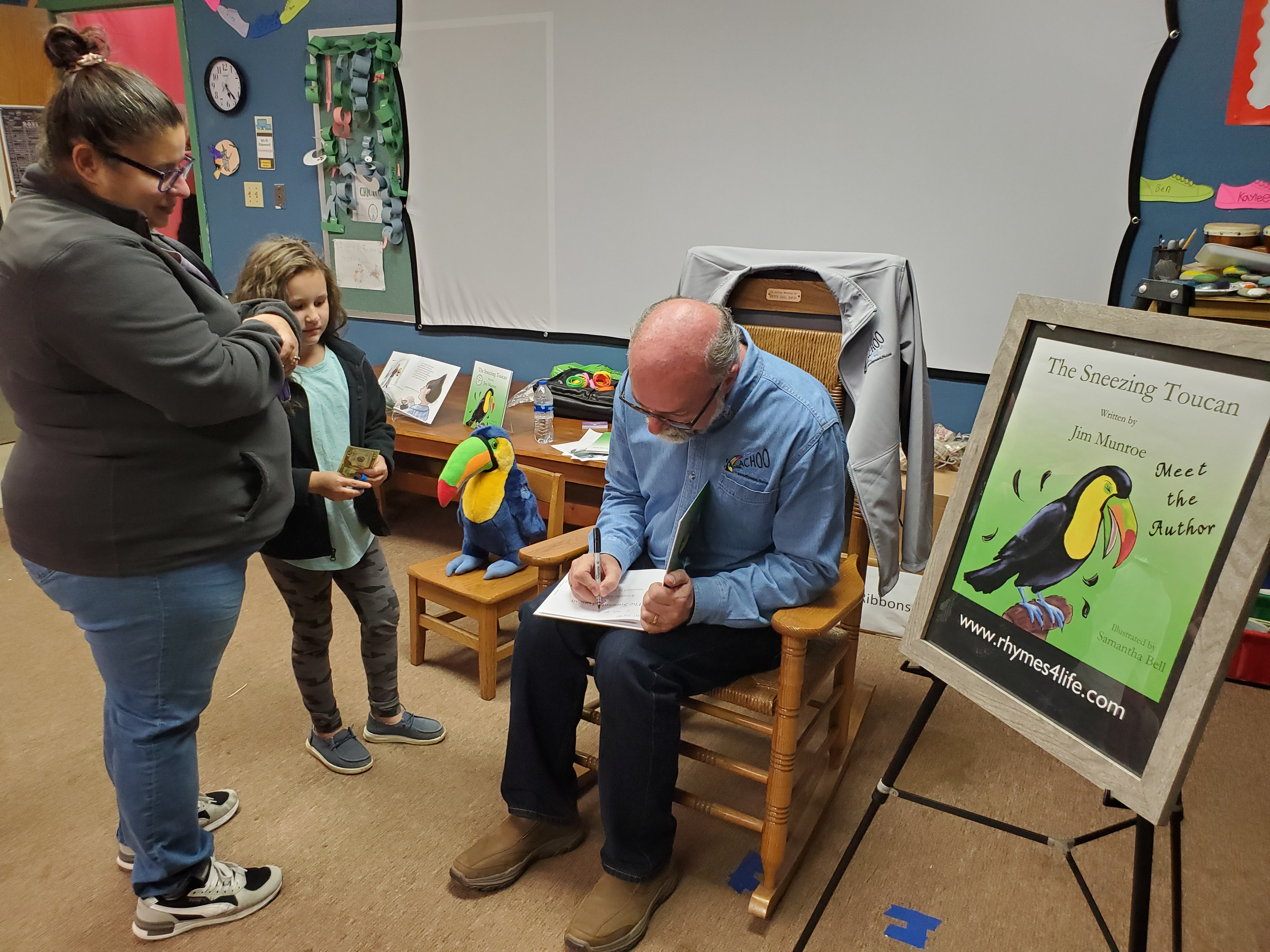 The Sneezing Toucan continues to fly around the country and we did some local flying too! Dixon Road Elementary School, along with hundreds of other schools, participated in a Scholastic Book Fair event. The Sneezing Toucan made an appearance and did a book signing and reading for Family Night. Shout out to Miss Holly Mangum for coordinating this terrific event at Dixon Road!